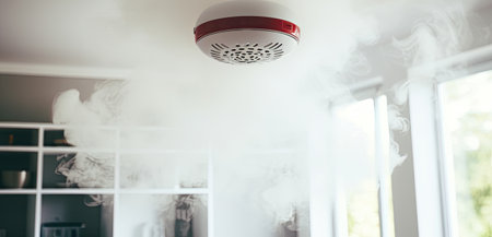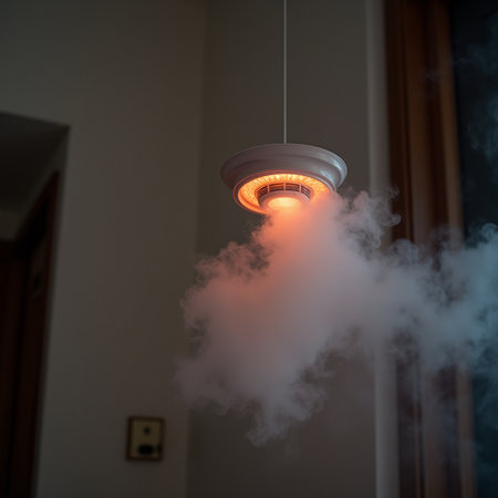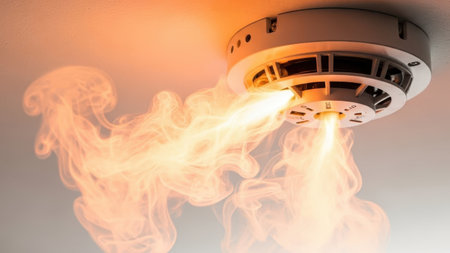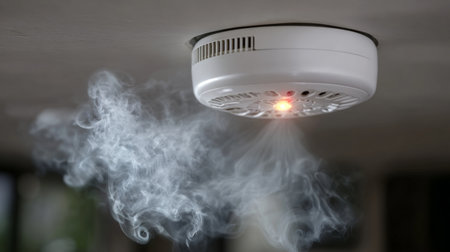 A smoke alarm activated by smoke, displaying a bright warning light. This image emphasizes the importance of fire safety measures in residential settings.