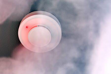 Close up shot of ceiling mounted smoke detector with white smoke and red warning light