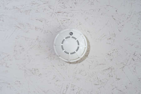 Old fire alarm on ceiling smoke detector safety and home protection from dangerous situations with fire, close-up.