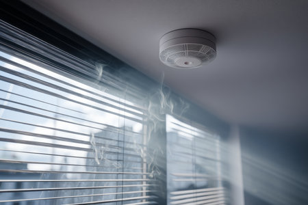 Ceiling smoke alarm in apartment surrounded by blinds realistic photography capture