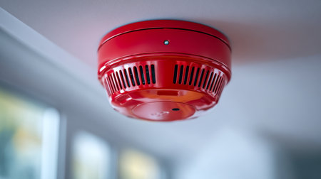 A vibrant red fire alarm capped on a bright white ceiling, with softly blurred sunlight streaming through distant windows, highlighting home safety in a cozy setting