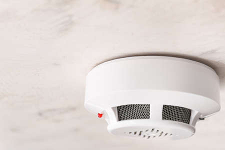 Smoke detector on white ceiling. Close up of smoke detector for fire protection systems. Selective focus.