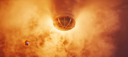 Smoke Alarm Detecting Smoke, Fire Safety Concept with Blurred Background of Simulated Fire Effects.