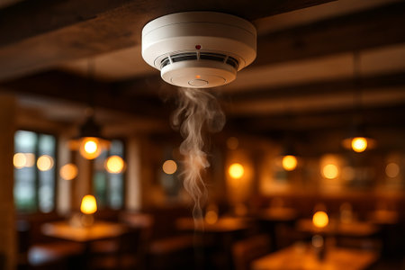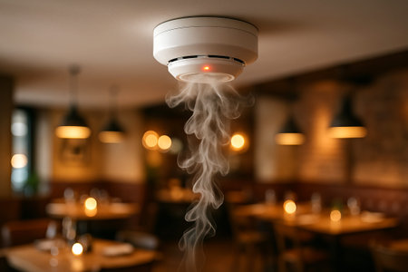 Smoke detector alert in a cozy restaurant interior with smoke rising, illustrating safety measures, fire prevention, and smoke detection technology.