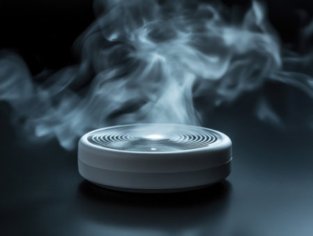 Modern Smoke Detector with Rising Smoke on Black Background - Safety and Emergency Concept in High Resolution.