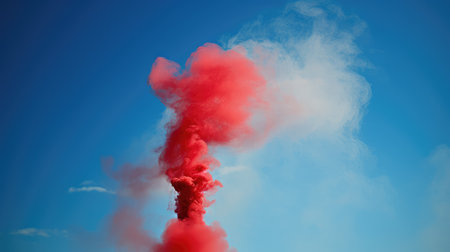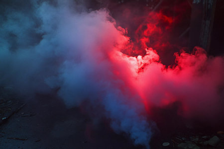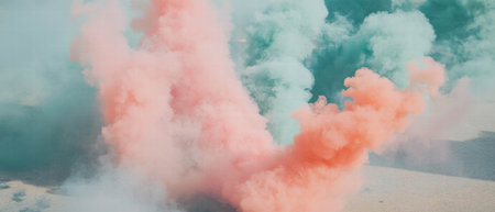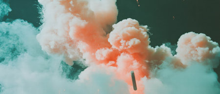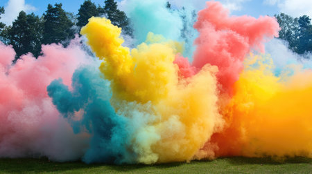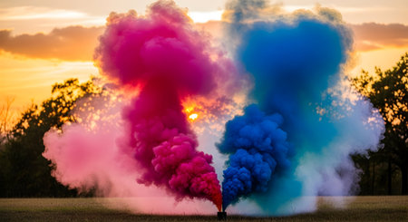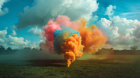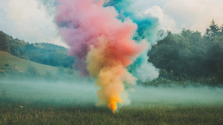 Vibrant clouds of smoke from a colorful smoke bomb drifting across a serene landscape, adding an element of surprise and intrigue.