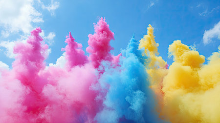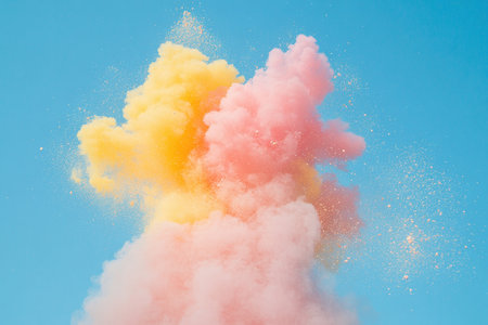 Color powder explosion against blue sky showing vibrant pink and yellow clouds in dynamic and artistic outdoor festive scene.