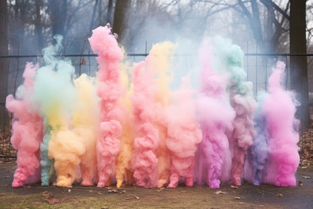 a bunch of pastel colored smoke bombs arranged in a row, all lit at once, created with generative ai