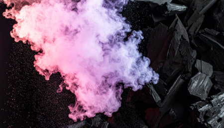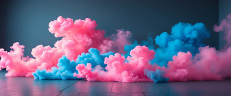 A vibrant abstract scene of pink and blue smoke mixing, with particles suspended in the air, creating a dynamic visual effect.