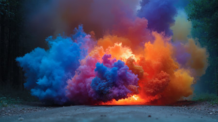 Colorful smoke bomb explodes in vibrant display along forest road during daylight