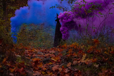 October forest blue and purple smoke bomb and witch black silhouette person Halloween holidays concept photography