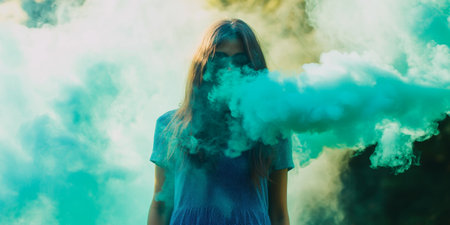 Swirling blue and green smoke surrounds a figure, enhancing a mystical ambiance during a serene outdoor moment.