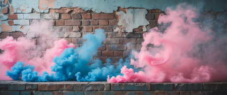 AI Generated. Pink and blue smoke rising from a brick wall background