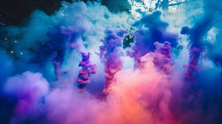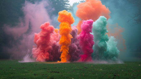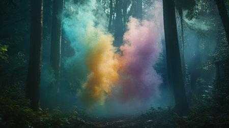 Colorful smoke plumes billow through a serene forest, creating a whimsical and dreamlike atmosphere. This captivating scene blends nature and art.