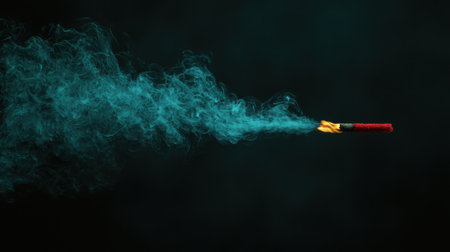 A vibrant smoke trail emanates from a colored object, creating a striking contrast against a dark background.