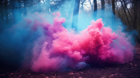 A stunning explosion of colorful smoke fills the forest air, blending hues of blue, pink, and orange. The enchanting scene is surrounded by lush trees, creating a magical atmosphere.