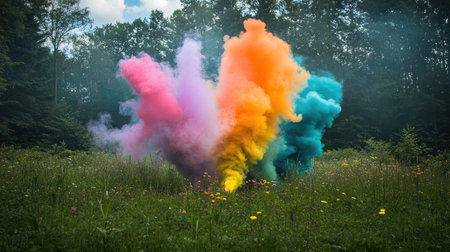 A vibrant explosion of colored smoke erupts in a tranquil forest setting, creating a stunning visual spectacle among wildflowers and greenery.