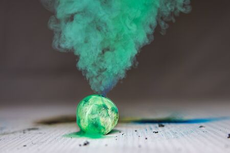 A close-up of colorful smoke billowing out from a smoke bomb, with vibrant hues blending together in a dynamic display, perfect for artistic compositions.