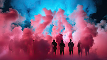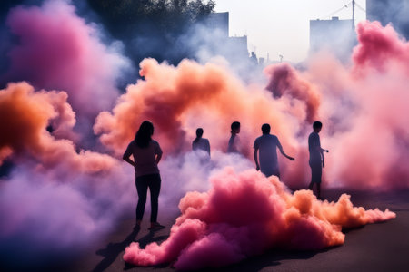 Colorful smoke filling the air during a festival, capturing the lively and vibrant atmosphere of the event. -