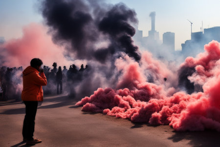 Smoke from a flare spreading through a dense crowd during a protest, with the vibrant colors of the smoke contrasting against the determined faces of the demonstrators.