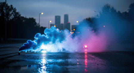 A dramatic display of colored smoke creates an atmospheric scene with urban silhouettes.