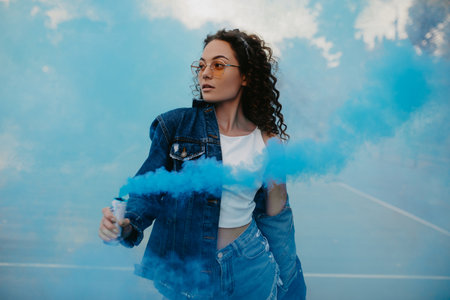 Beautiful young woman in sunglasses stands and holds colored smoke bomb in her hand with blue smoke.
