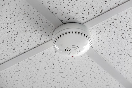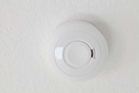 A smoke detector hangs on the white ceiling. Fire prevention device in the home or office. Fire safety system.
