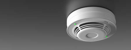 Smoke detector, fire alert equipment for home and business fire safety. Device moulded on interior room ceiling, copy space, banner. 3d illustration
