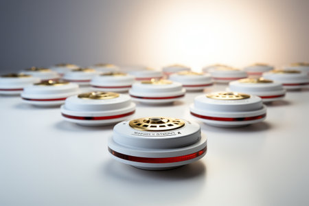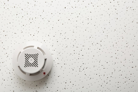 Modern Smoke Detector Mounted on White Ceiling with Gridded Sensor and Battery Compartment