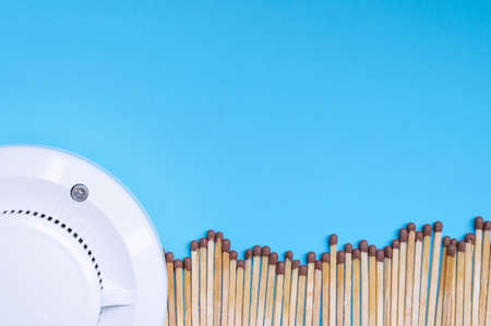 Fire detector and a bunch of matches on a blue background. Copy-space