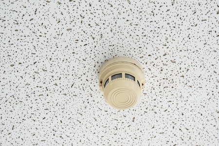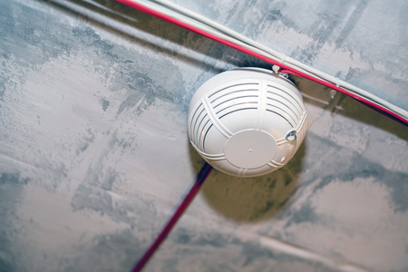 Old fire alarm on ceiling smoke detector safety and home protection from dangerous situations with fire, close-up.