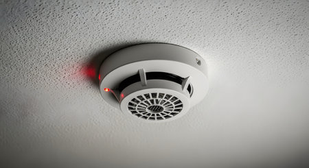 A smart smoke detector with a glowing indicator light on a ceiling, symbolizing home safety automation. Clean space for text.