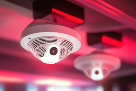 Smoke detectors installed on the ceiling feature red indicator lights, enhancing safety in an indoor space.