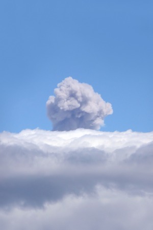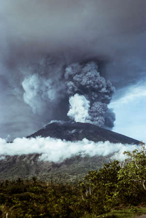 Mount Agung erupting plume. During volcano eruption thousands of people was evacuated from dangerous zone. Airline flights to Bali were canceled, Denpasar airport closed because of volcanic ash clouds