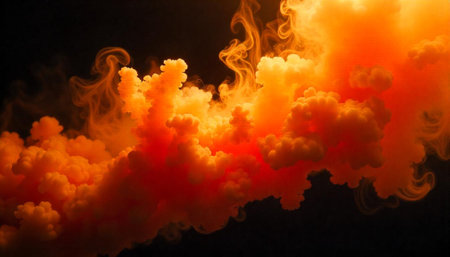 Hot fire explosion with fantastic thick smoke on dark background for graphic design. abstract backdrop. glow effect. 3d rendering digital illustration