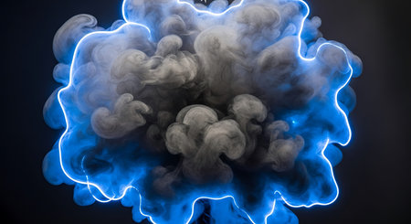 Energetic abstract explosion features turbulent grey smoke surrounded by luminous blue neon light. Swirling clouds create a dramatic, dynamic visual. Perfect for backgrounds, technology themes, or design elements requiring a powerful and striking effect.