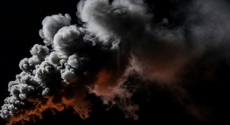 Dense billowing smoke clouds rising from dark depths. Hot orange light reflects on base of thick vapor creating intense high contrast visual. Powerful industrial exhaust or wildfire smoke simulation for catastrophic event disaster concept art.