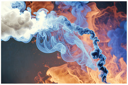 Puffs of multi-colored smoke scattering on a white background and rising up like flames of orange-blue and white fire, taking on the mystical shape of an alien's head.