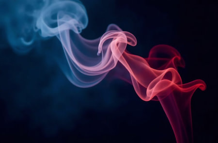 Swirls of vibrant red and delicate gray smoke flow gracefully against a dark background creating a dramatic scene.
