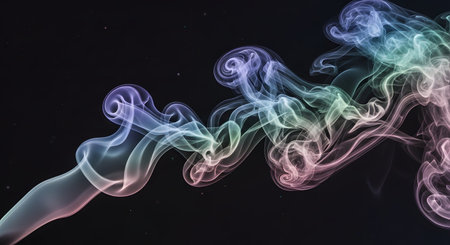Wisps of vibrant, multicolored smoke curl and twist against a deep black backdrop, creating an abstract and ethereal visual.