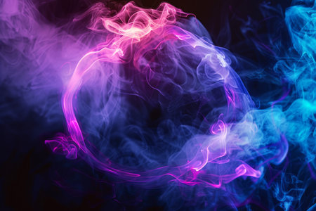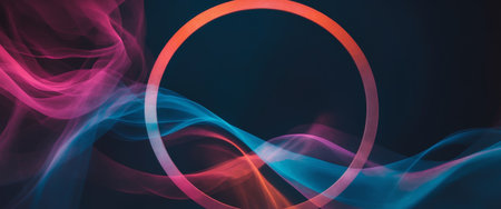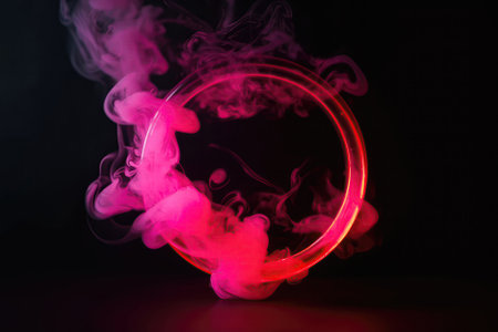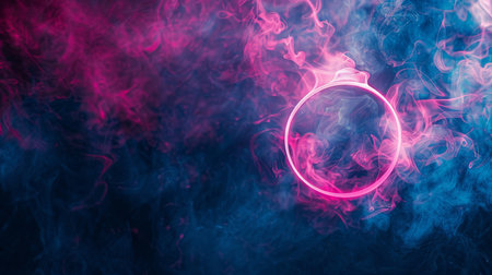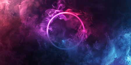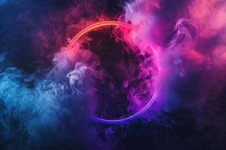 A captivating neon circle is elegantly surrounded by a swirling mass of colorful smoke, ideal for modern media projects