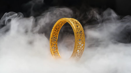 This stunning image features an elegant gold bracelet delicately adorned with intricate patterns, shrouded in soft white smoke, creating a magical and captivating ambiance.