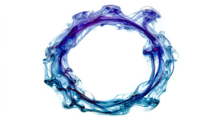 An abstract composition features a circular form created by swirling smoke. The smoke presents a gradient of blue and purple hues. The image displays high contrast against a white backdrop, enhancing the visual effect. Suitable for various design applications, this image could be used in advertising or editorial projects.