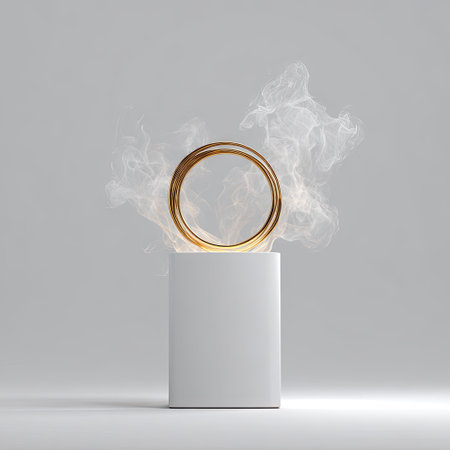 A round gold ring in a white box with smoke on a gray background