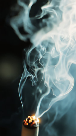 A lit cigarette smolders, releasing swirling clouds of smoke against a dark backdrop, creating a moody and atmospheric visual. The flame flickers softly at the tip.