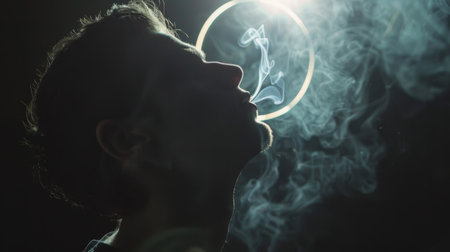 A person blowing a smoke ring in a dark room, with the ring floating gracefully through the air.