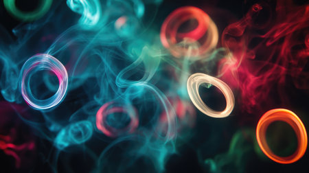 A mesmerizing abstract image that beautifully showcases colorful smoke alongside glowing neon circular patterns