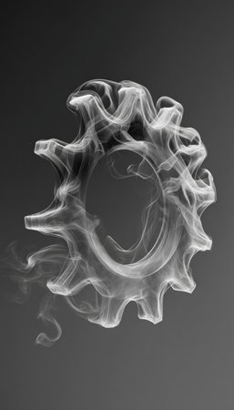 A gear shape crafted from flowing smoke against a steel gray backdrop. The wisps create a mechanical structure with translucent edges and a clean, ethereal appearance.