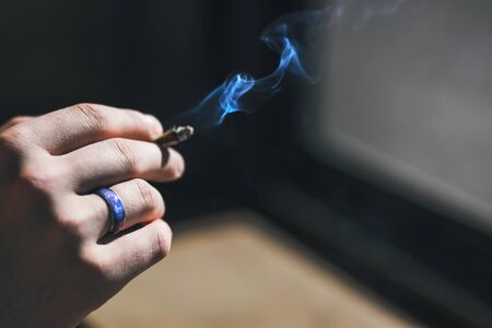 The hand of a man with a blue ring with a Christian cross holds the butt of a cigarette emitting blue toxic smoke.
