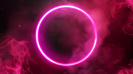 Intense neon light circle with smoke background. Modern fog effect with led ring design template. A smoky cloud and a laser round frame surround a music or sport abstract glowing modern graphic.